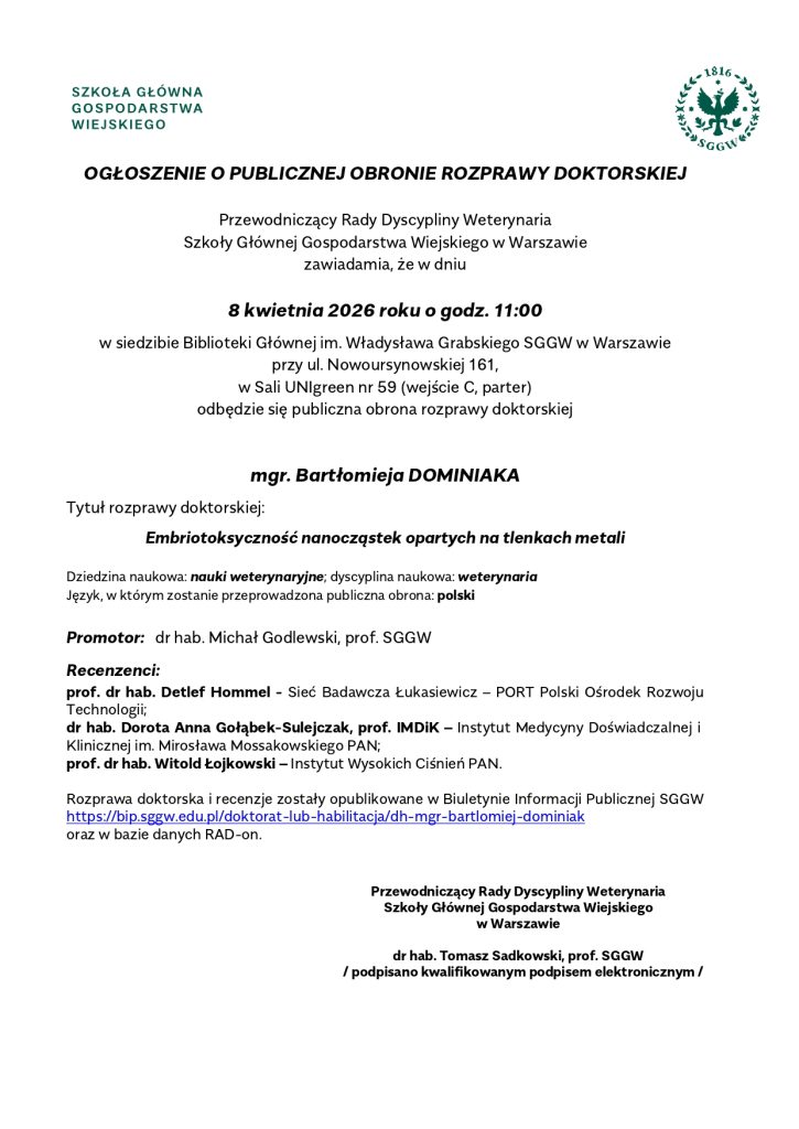 Ogłoszenie o publicznej obronie rozprawy doktorskiej mgr. Bartłomieja Dominiaka