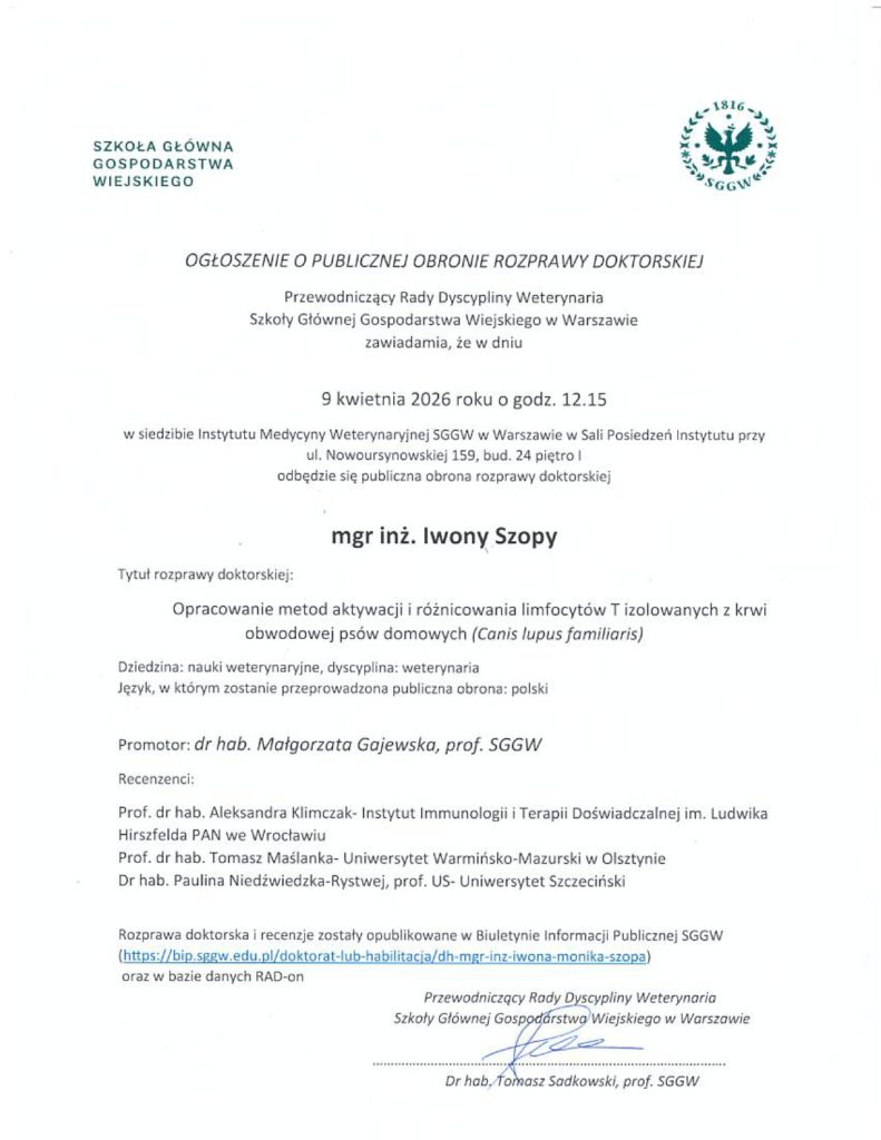 Ogłoszenie o publicznej obronie rozprawy doktorskiej mgr inż. Iwony Szopy